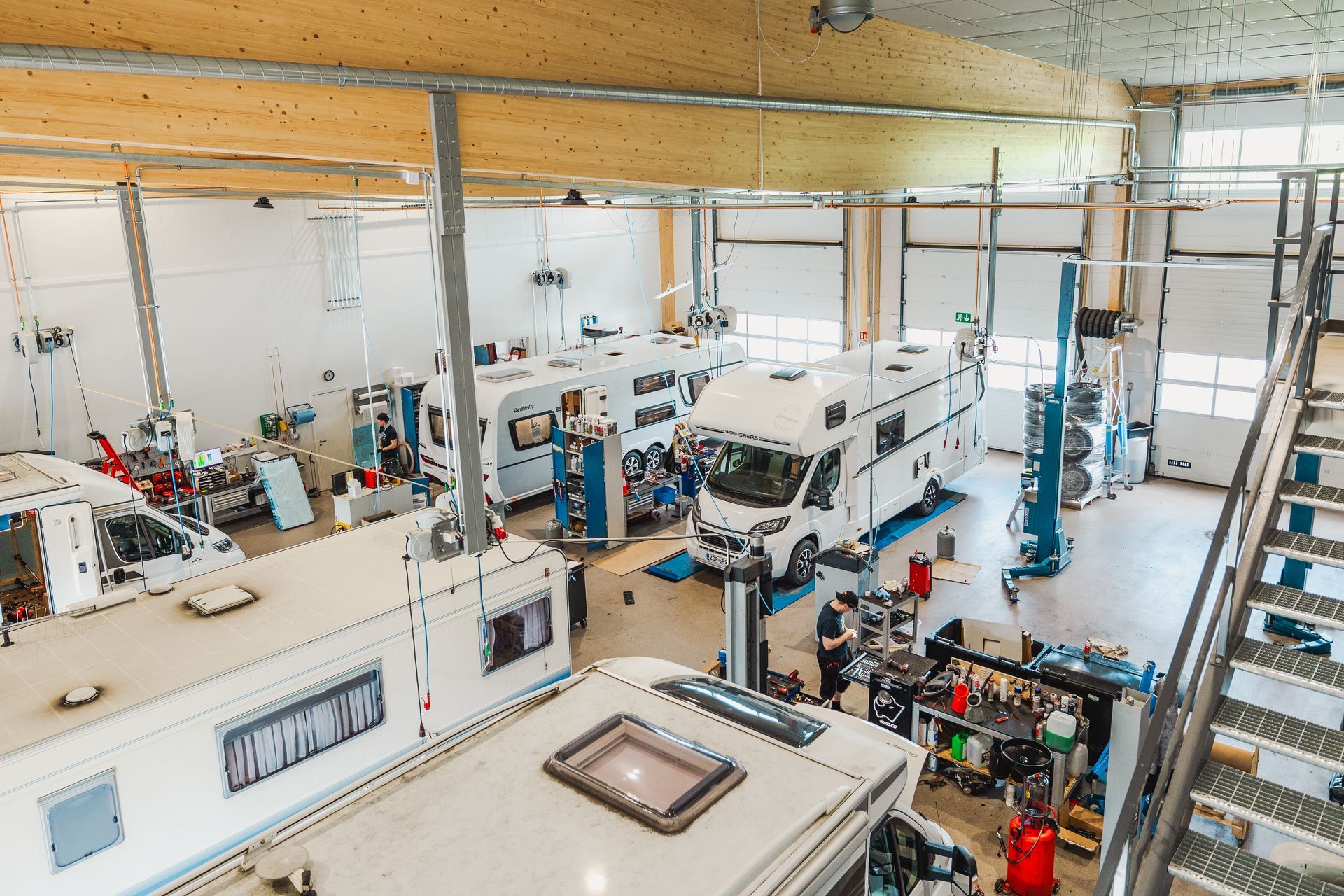 Valoisa korjaamo on läpiajettava ja varustettu ajoneuvonostimilla.